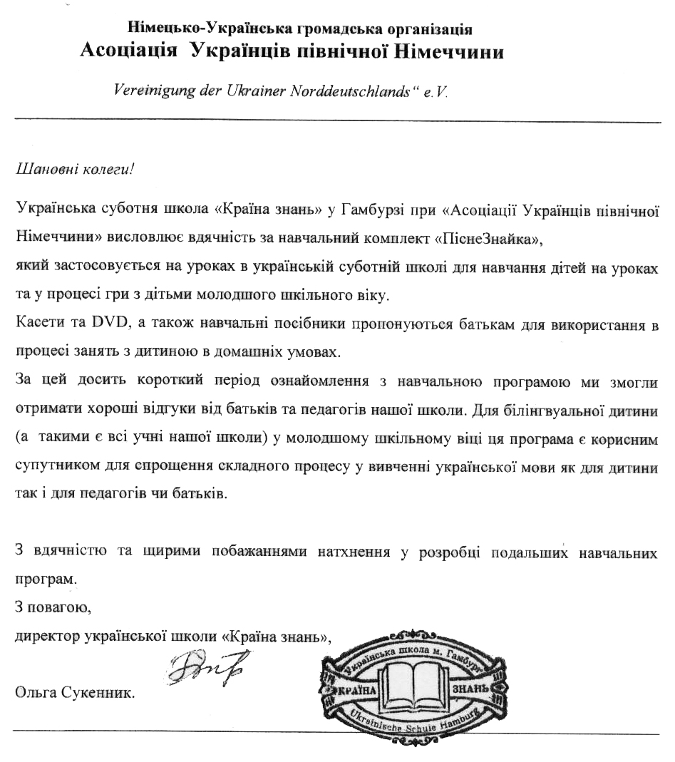 Повідомляємо, що навчальні матеріали та відеопосібники, отримані з МЗС України Генеральним консульством України в Гамбурзі передано українській суботній школі «Країна знань» при Асоціації українців Північної Німеччини. Навчальні комплекти «ПіснеЗнайка» активно використовуються під час проведення навчання дітей молодшого та середнього шкільного віку в згаданій школі. Хотіли б висловити вдячність за підтримку та розвиток української мови серед громадських організацій українців, що проживають за кордоном.