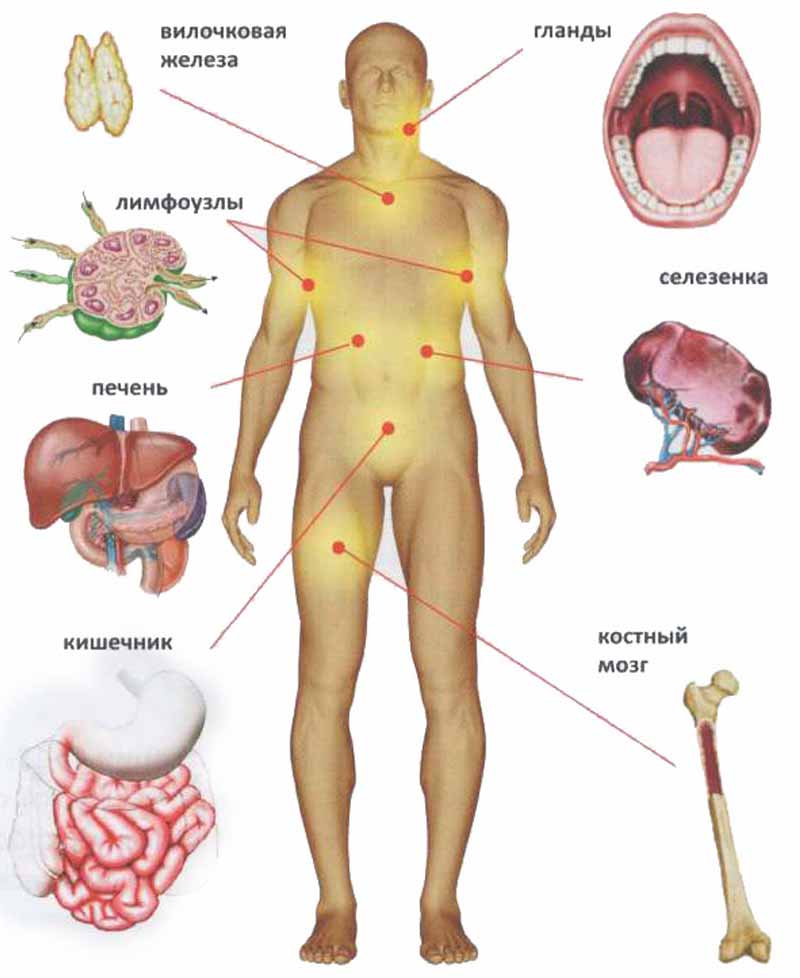 (мигдалини, тимус, лімфатичні вузли, селезінка, кістковий мозок,